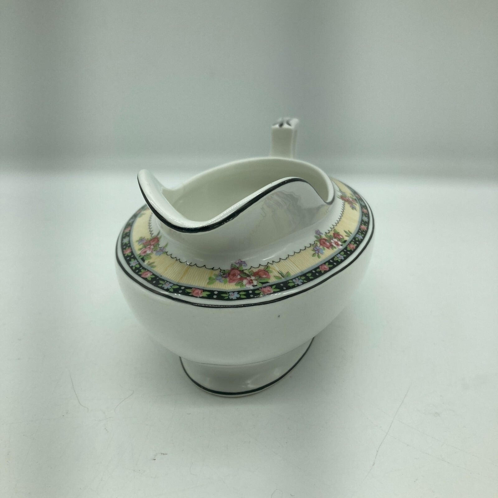 This genuine 1925 Homer Laughlin L5N set from the USA features three exquisite serving pieces: a butter/cheese dome, a covered sugar dish, and a large gravy boat, all adorned with the elegant Kwaker pattern. Made of fine porcelain and bearing Homer Laughlin’s signature, this vintage set displays a delicate rose motif bordered by yellow and black trim. Perfect for fans of Cottage Core style, it brings classic charm to any dining collection. Impeccably maintained, these pieces add a nostalgic and refined touch to your table, making them an essential addition for collectors and vintage enthusiasts.