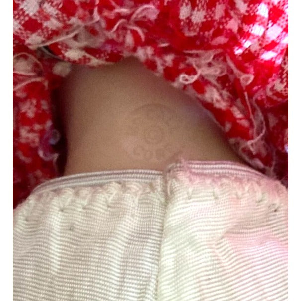 2 red bows (1 has a hairpin attached) - most likely made by the little girl who once played with this doll